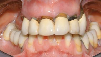 A 35-year-old Caucasian female presenting with advanced periodontal disease involving both the maxillary and the mandibular dentition was referred for evaluation. The patient, a non-smoker in good general health, requested treatment for recurrent periodontal abscesses, tooth mobility, and discomfort during chewing, as well as restoration of her missing teeth with a fixed prosthesis to improve mastication and esthetics. All residual maxillary teeth exhibited plaque deposits, deep pockets, bleeding on probing, and class III mobility and were evaluated as hopeless. All residual mandibular teeth except tooth 37 could be maintained after periodontal therapy.