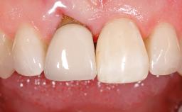 In the fall of 2003, a female patient was referred to the School of Dental Medicine, University of Geneva, for treatment of a traumatic fracture of a maxillary left lateral incisor. While at home, the patient fell down and hit a heating radiator with the anterior maxilla. During the initial examination, a week after the accident, the patient was in good general health condition and signs of pain/discomfort or clinical/radiographic infection were not observed. A moderate and localized hematoma with associated swelling persisted on the left side of the upper lip. Clinical assessment revealed a horizontal fracture at the cervical third of the anatomic crown of the maxillary left lateral incisor. In addition, a vertical crack line projecting into the cementoenamel junction (CEJ) called for a comprehensive assessment of the tooth restorability options.