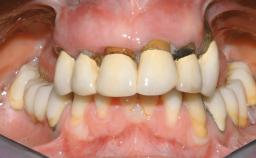 A fully edentulous 65-year-old woman was referred to our clinic for esthetic and functional dental rehabilitation. The patient presented with inadequate complete maxillary and mandibular prostheses, insufficient vertical dimension, and extensive tooth wear. The clinical examination and anamnesis showed no local or systemic contraindications, no signs or symptoms of bruxism, and an absence of smoking habits. The treatment proposed was implant placement in the mandibular interforaminal area and immediate loading with a fixed definitive prosthesis. A removable mucosa-supported complete prosthesis was indicated for the upper jaw, since its bone structure offered satisfactory retention and the financial condition of the patient disfavored a full-mouth implant-supported rehabilitation.