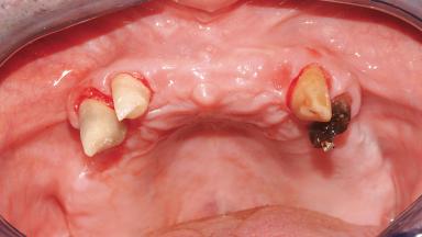 A 61-year-old male patient with a failing fixed maxillary rehabilitation and a fixed mandibular rehabilitation requested a new fixed maxillary rehabilitation. The patient was wearing a temporary metal-reinforced maxillary bridge inserted two years before the consultation. He reported that his previous dentist did not want to insert a definitive framework because he considered the residual teeth to have a negative prognosis. The patient reported a history of recurrent caries and endodontic complications as the main reason for the previous extractions. The anamnesis was negative for periodontal disease and bruxism. The patient’s chief compliant was the mobility of his maxillary prosthesis, which needed to be re-cemented frequently, and discomfort during chewing.Moreover, the patient was not satisfied with the esthetic appearance of his maxillary teeth, which he found too long. The patient asked for a stable and comfortable fixed maxillary rehabilitation and firmly rejected any removable solution.