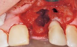 A 33-year-old female patient presented with an upper left central incisor that required extraction after a failed endodontic therapy. The tooth had been traumatized when the patient was a teenager and had undergone several endodontic treatments, including two apicectomy procedures. The patient was in good health and did not smoke. Clinical examination showed that the patient had a high lip line. In full smile, the gingival margins of the upper teeth were visible to the first molars. The gingival margins of central incisors 11 and 21 were only just showing. Examination of tooth 21 confirmed that the tooth was mobile and had hypererupted by 1 mm.