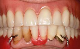 A 77-year-old woman was referred to our department by an oral and maxillofacial surgeon for rehabilitation of her dentition. She had been diagnosed with squamous cell carcinoma 6 months earlier and was treated surgically by right mandibular rim resection and local floor-ofmouth resection extending to tooth 33. No radiotherapy or chemotherapy had been considered necessary. The patient complained that she was unable to eat and that her face was disfigured due to a lack of lip support on the resection side. She reported a history of well-controlled asthma and angina, in addition to cardiac arrhythmia and an allergy to penicillin. Her medication included acetylsalicylic acid and diltiazem.