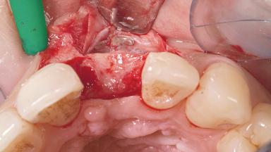A 30-year-old female patient had lost tooth 21 and was referred to our clinic for consultation and treatment. Due to advanced apical infection, tooth 21 had been extracted two months earlier at another clinic and an acrylic-resin tooth had been bonded to the adjacent teeth. The patient desired implant treatment to avoid any damage to the adjacent natural teeth. While the patient had no history of any systemic disorder, she was a heavy smoker and exhibited medium to advanced periodontitis in the entire jaw. After the initial treatment to achieve a pocket probing depth of less than 4 mm and no bleeding on probing, a decrease in the height of the papillae mesial and distal to the extraction site and overall gingival recession were observed.