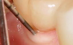A 37-year-old male patient was referred to the Department of Periodontology at the University of Bern, Switzerland, by a private dentist. Tooth 21 had been lost due to trauma and had been replaced with an implant and a cemented single crown. The tapered-effect tissue-level implant had a diameter of 4.1 mm, a length of 12 mm, and a sandblasted and acid-etched (SLA) surface (Straumann Dental lmplant System; Institut Straumann AG, Basel, Switzerland). The metal-ceramic crown had been cemented permanently, leaving a submucosal gap between the implant shoulder and the crown margin. Absence of marginal bone loss apical to the polished transmucosal neck of the implant could be observed .