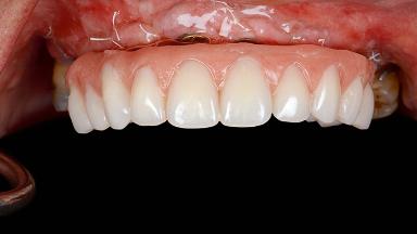 A 55-year-old woman was referred to our clinic for implant therapy. She was healthy and had stopped smoking two years previously. Ten years before, the patient had received extensive dental treatment in both jaws. The patient reported that her dental condition had deteriorated progressively since that time. At the time of presentation, the maxillary bridge was loose. The clinical and radiographic examinations revealed a highly compromised situation for all the teeth that supported the bridge and for other teeth.