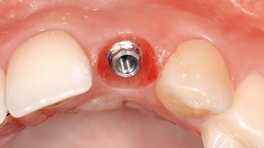 An 18 year-old female patient, a non-smoker,presented in 1999 during orthodontic treatment with a tooth gap in position 22 due to a congenitally missing permanent tooth 22 and a peg-shaped permanent tooth 12. Orthodontic treatment had started four years before, when the patient was 14 years old, to correct a complex situation by maxillary expansion in combination with a bracket treatment. The patient had been referred by the orthodontist for clarification of a possible implant therapy to define the ideal size of the tooth gap at site 22 as well as the necessary root parallelization for implant placement,i.e. final minor orthodontic corrections to create an ideal situation for implant placement.