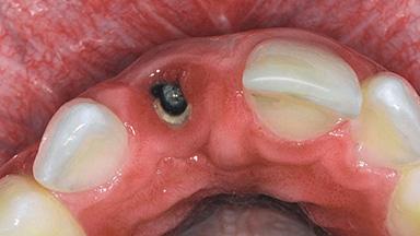 A 23-year-old female, healthy and non-smoking patient had had tooth 11 temporarily restored following a trauma in adolescence. As the patient’s growth had since come to an end and the crown had fractured, she requested an implant-supported restoration of tooth 11. Moreover, the contralateral tooth 21 presented an old composite restoration at the mesial incisal edge. The periodontal tissues were healthy with periodontal probing depth values below 3 mm, but some inflammation was observed around the semi-submerged root of tooth 11.