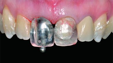 A 30-year-old patient presented at our clinic with a chief complaint of pain in her endodontically treated right maxillary central incisor (tooth 11) with a post-and-core and a fixed single crown. She had a very high lip line, a medium to thin soft-tissue phenotype, and a medium scalloped gingival contour. She also had high esthetic expectations because of her young age and beautiful smile. However, her expectations were realistic and she understood the risks of the treatment. At the initial clinical examination there was a slight mobility of tooth 11; no fistula was observed. The patient also had a single crown on the adjacent tooth 21. Both restorations were old and esthetically deficient. A digital periapical radiograph showed a very small periapical radiolucency, a thick intraradicular post, and no separation between root fragments.