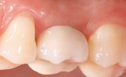 In February 2002, a 31-year-old non-smoking male patient was referred by his dentist after the fracture of the crown of the maxillary right second premolar, tooth 15. The fracture line was located apically to the gingival margin, particularly on the palatal side. Radiographic examination revealed the presence of a previous endodontic treatment with a non-ideal apical seal. There were no signs of periapical osteolysis. The level of the interproximal bone was normal. The patient’s medical history did not reveal any significant findings and he was in good general health.