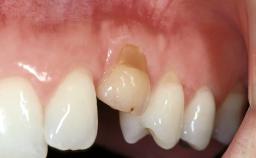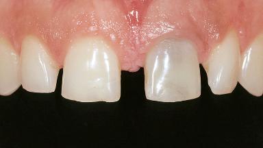 The 23-old-male patient, a light smoker (less than five cigarettes per day), presented with a non-vital and discolored tooth 21. The patient was in good general health, and his medical history was without significant findings. He suffered from pain originating from mobile tooth 21. Because of the discoloration of tooth 21, the patient asked to have his esthetic appearance improved.Tooth 21 had been endodontically treated after trauma,and an apicoectomy had been performed. At full smile, the patient had a medium smile line, exposing the full teeth and part of the gingiva. The patient’s gingival biotype was medium thick, with a sufficiently thick band of attached keratinized gingiva. The tissue was free of recessions or other defects.