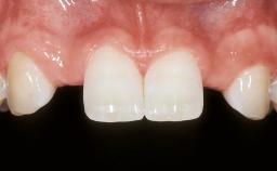 The 23-old-male patient, a light smoker (less than five cigarettes per day), presented with a non-vital and discolored tooth 21. The patient was in good general health, and his medical history was without significant findings. He suffered from pain originating from mobile tooth 21. Because of the discoloration of tooth 21, the patient asked to have his esthetic appearance improved.Tooth 21 had been endodontically treated after trauma,and an apicoectomy had been performed. At full smile, the patient had a medium smile line, exposing the full teeth and part of the gingiva. The patient’s gingival biotype was medium thick, with a sufficiently thick band of attached keratinized gingiva. The tissue was free of recessions or other defects.