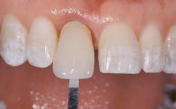 The 54-year-old male patient, a non-smoker, had ceramometal crowns on teeth 11 and 12 that no longer met his esthetic needs. The patient was free of pain. His medical history was without significant findings, and the patient was in good general health. The patient’s wish was to improve the esthetics of his anterior teeth. At full smile, the patient presented a medium to high lip line, displaying the full crowns and the marginal gingiva. The harmony of the gingival margin was disrupted by the now rejected ceramo-metal crowns on teeth 11 and 12. The crowns differed from the respective contralateral teeth in shape, texture, and color. The patient’s gingival biotype was thick, with a broad band of attached keratinized gingiva and a moderate (medium) scallop height. The soft tissues were free of recessions. The patient’s soft-tissue situation was favorable due to the slight soft-tissue excess at the buccal gingival margin of tooth 11 compared to that of tooth 21.