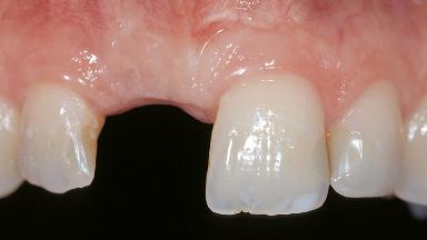 This 37-year-old female patient, a non-smoker, complained about discomfort and gingival problems at tooth 11. She was in good general health, and her medical history was without significant findings. The clinical inspection of the oral cavity revealed a fistula originating at tooth 11. Radiological examination of the crowned tooth 11 re- vealed a root-canal filling, status after apicoectomy, and a large periapical bone defect, as well as secondary caries. The adjacent teeth, 21 and 12,were periodontally healthy. They had interdental composite fillings that the patient wanted replaced. The bone crest levels of teeth 12 and 21 well maintained, providing potential soft-tissue support.