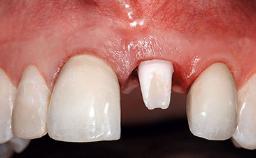 A 49-year-old female patient was referred for implant therapy to replace the upper right central incisor (tooth 11). The tooth had been assessed by an endodontist who diagnosed a vertical fracture of the root. The tooth had a hopeless prognosis and needed to be extracted. The patient was healthy and was not taking any medications. She was allergic to penicillin. The patient had high esthetic demands but her expectations were realistic. The extraoral examination revealed no facial asymmetries. The right temporomandibular joint demonstrated an opening click but was otherwise asymptomatic. The lip line was high with a significant gingival display.
