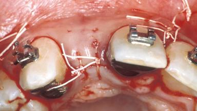 A healthy 32-year-old female patient presented at the clinic for recementation of a resin-retained fixed partial denture (RRFPD) and for a consultation on treatment options to replace the congenitally missing tooth 12. She desired a more esthetic and functional treatment option than her current one. A detailed examination of the teeth and periodontium adjacent to the edentulous space was performed to assess the esthetic risk for implant therapy. The intraoral exam revealed a pre-existing metal-reinforced RRFPD replacing tooth 12. Discoloration of teeth 13 and 11 due to the large metal retainers on the prosthesis was evident.The patient reported several occasions on which the prosthesis had debonded and had to be reinserted. It had become a nuisance for her,and she wanted a more permanent solution. Upon comparison of the adjacent lateral incisors, the mesiodistal width of 12 was slightly smaller and 22 was slightly undercontoured in its incisal embrasure.