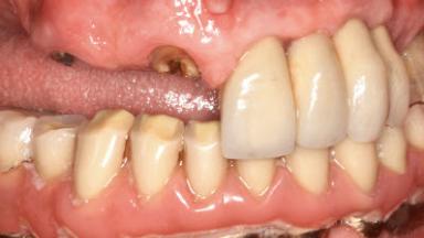 A 66-year-old patient presented because of retention loss of the tooth-supported FDP in the right maxilla (x-13-x-11). The mandibular full-arch implant-supported reconstruction (x-i34-i33-x-x-x-x-i43-i44-x) had suffered extreme wear. His medical history revealed high blood pressure, controlled with anti-hypertensive medication. The patient was a light smoker (2 to 3 cigarettes per day). The existing reconstructions had been performed alio loco about five years previously. That treatment had taken an extensive amount of time, and as early as during the fabrication of the reconstructions, multiple complications had occurred with the provisionals.