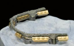In July 2006, a 66-year-old edentulous woman received new complete dentures in both the maxilla and mandible at the Department of Prosthodontics, Propaedeutics and Dental Materials (University of Kiel, Germany). Both dentures had a perfect fit and met high dental standards. To reduce the risk of fracture of the mandibular denture, it was reinforced with a mesh CoCr framework.