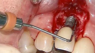 This case describes both a surgical and an anti-infective approach for the management of peri-implantitis, including treatment of the entire dentition to eliminate any deep periodontal pockets that could serve as reservoirs for bacterial re-colonization at the implant site. A 65-year-old female patient was referred to the periodontist in 2013 for assessment and management of an infection at implant 12. On examination, probing depths at implant 12 were 11 mm with suppuration and bleeding on probing.
