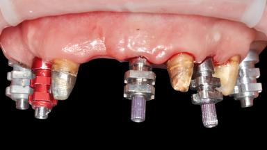 A 62-year-old male patient, a non-smoker, presented after 4 years without recall and with a history of recurrent abscesses on the maxillary central incisors. He was otherwise in good health but had history of periodontitis, so his associated risk was rated as moderate. His main complaint was difficulty with chewing, so he wanted to restore his dentition in the shortest possible time and without any removable provisional prosthesis. The patient wanted a definitive fixed restoration and was looking for an improvement in function, while maintaining the esthetics as much as possible.