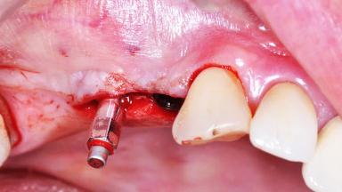 Surgical treatment of a 68-year-old female patient who experienced failure of her conventional bridge in the right maxilla. After removal of the compromised abutment teeth and a healing period of 6 weeks, a sinus floor elevation procedure using the lateral window technique and a composite graft to correct the insufficient bone height is carried out.