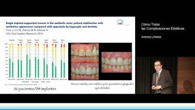 Actualmente la colocación de implantes dentales es un procedimiento clínico que se lleva cabo en la mayoria de las consultas de nuestra geografía. Este aumento pone de manifiesto el gran número de implantes colocados por año en detrimento de la conservación de los dientes de los pacientes. Este crecimiento asociado a la, en ocasiones, poca especialización de los profesionales, hace que también se incremente el porcentaje de complicaciones estéticas y biológicas de los mismos. Hoy en día los pacientes son más exigentes, la estética adquiere un rol decisivo en la percepción del éxito o fracaso de un tratamiento por parte de los mismos. Conocer estos y otros elementos se hace necesario a la hora de establecer un plan de tratamiento definitivo, considerando que la edad y el sexo son factores determinantes en esta percepción. En la presentación se exponen diferentes situaciones clínicas con sus posibles causas y los procedimientos clínicos para resolverlas, mostrando la evolución de los mismo y el resultado final.