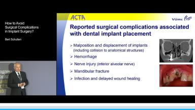 This lecture focuses on the causes, prevention, and management of certain complications that may arise during the practice of surgical dental implantology. The complications briefly discussed include: malposition and displacement of implants into anatomic spaces surrounding the maxillary and mandibular bones; hemorrhage due to direct vessel injury or insufficient preoperative evaluation of the medical history; urgent management of hematomas in the floor of the mouth; prevention of inferior alveolar nerve injury; and prevention and management of fractures of the atrophic mandible. It is imperative that dentists are knowledgeable and prepared to react appropriately in the event of surgical complications.